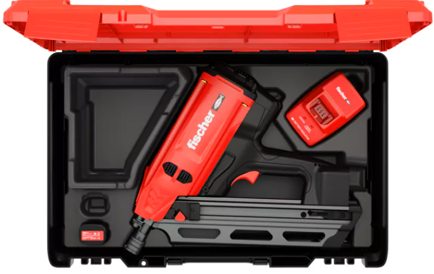 • Fischer gas actuated fastening tool FGW 90F - 95 joules setting energy, 3.5 kg with battery, 34° angle of magazine, Capacity of 60 nails